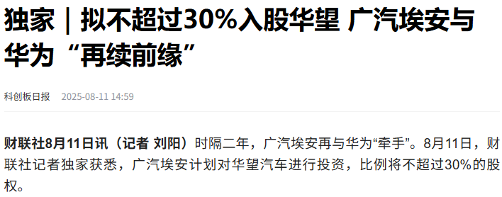 时隔两年,曾被按下“暂停键”的广汽与华为合作迎来戏剧性转折。电动知家消息,8月11日,据财联社报道,广汽埃安计划对华望汽车进行股权投资,持股比例不超过30%。华望汽车作为广汽集团与华为战略合作的核心载体,于今年3月由广汽集团投资15亿元成立,目标直指30万元级高端智能电动车市场,首款车型预计2026年正式面世。